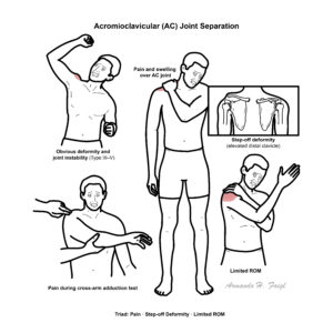 Step-off deformity – A visible or palpable prominence of the distal clavicle relative to the acromion, often seen in higher-grade AC separations.