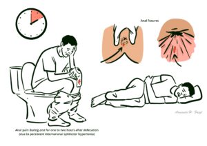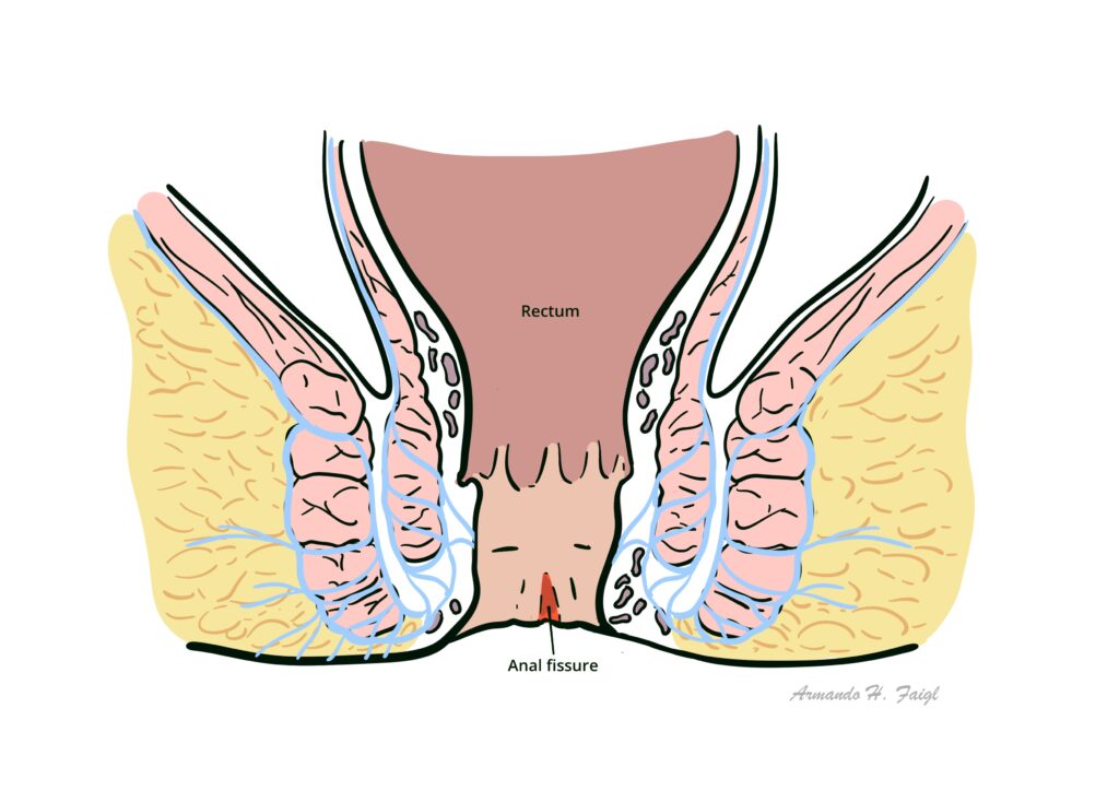 Anal fissure is a split in the skin of the distal anal canal. It presents with severe pain on defecation, like passing “glass shards”, and rectal bleeding. It is more frequently diagnosed in younger and middle-aged individuals. Anal fissures are mostly caused by passage of hard stool but can also be a result of other conditions, like Crohn’s disease.1,2