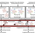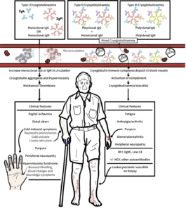 Cryoglobulinaemic vasculitis is an immune complex–mediated small to medium vessel vasculitis caused by circulating cryoglobulins—immunoglobulins that precipitate below 37 °C and redissolve on warming. These immune complexes deposit in vessel walls, activate complement (typically with marked C4 consumption), and drive leukocytoclastic vasculitis. “Mixed” CV (types II and III) is most often linked to hepatitis C virus (HCV), autoimmune diseases, or B-cell clonal disorders, while type I CV is monoclonal and associated with plasma-cell dyscrasias or lymphoproliferative disorders. Adults are most commonly affected.