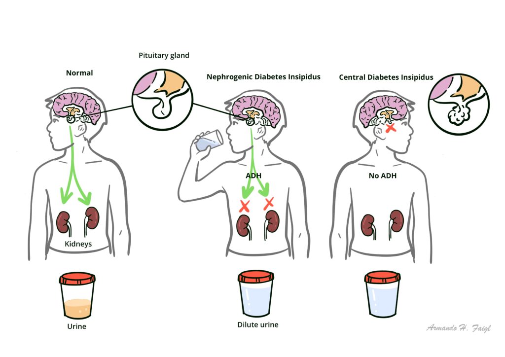 Diabetes Insipidus (DI) is associated with inadequate arginine vasopressin (known as antidiuretic hormone) secretion or renal response to arginine vasopressin, resulting in hypotonic polyuria and a compensatory/underlying polydipsia. There are two main types of diabetes insipidus, central DI and nephrogenic DI