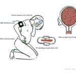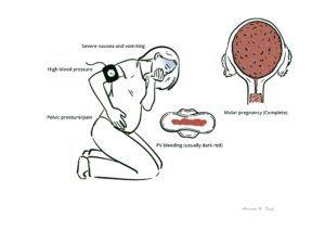Picture molar pregnancies as an exaggerated pregnancy: e.g., larger uterus, severe nausea and vomiting, anaemia and thyroid issues .