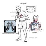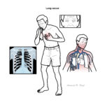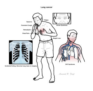 Small proportion of patients with lung cancer are asymptomatic when diagnosed. In these cases, a lung nodule usually is found incidentally on chest x-ray or CT. Common signs and symptoms include cough, dyspnea, chest pain, fatigue, weight loss and hemoptysis.