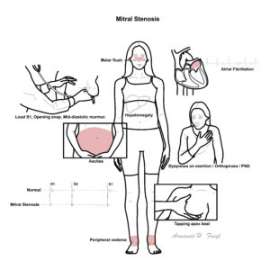 Mitral stenosis causes an obstruction to blood flow from the left atrium to left ventricle usually as a result of rheumatic heart disease. The stenosis results in increased pressure in the left atrium, pulmonary vasculature and right side of heart. Mitral valve disease is a frequent cause of heart failure and death.