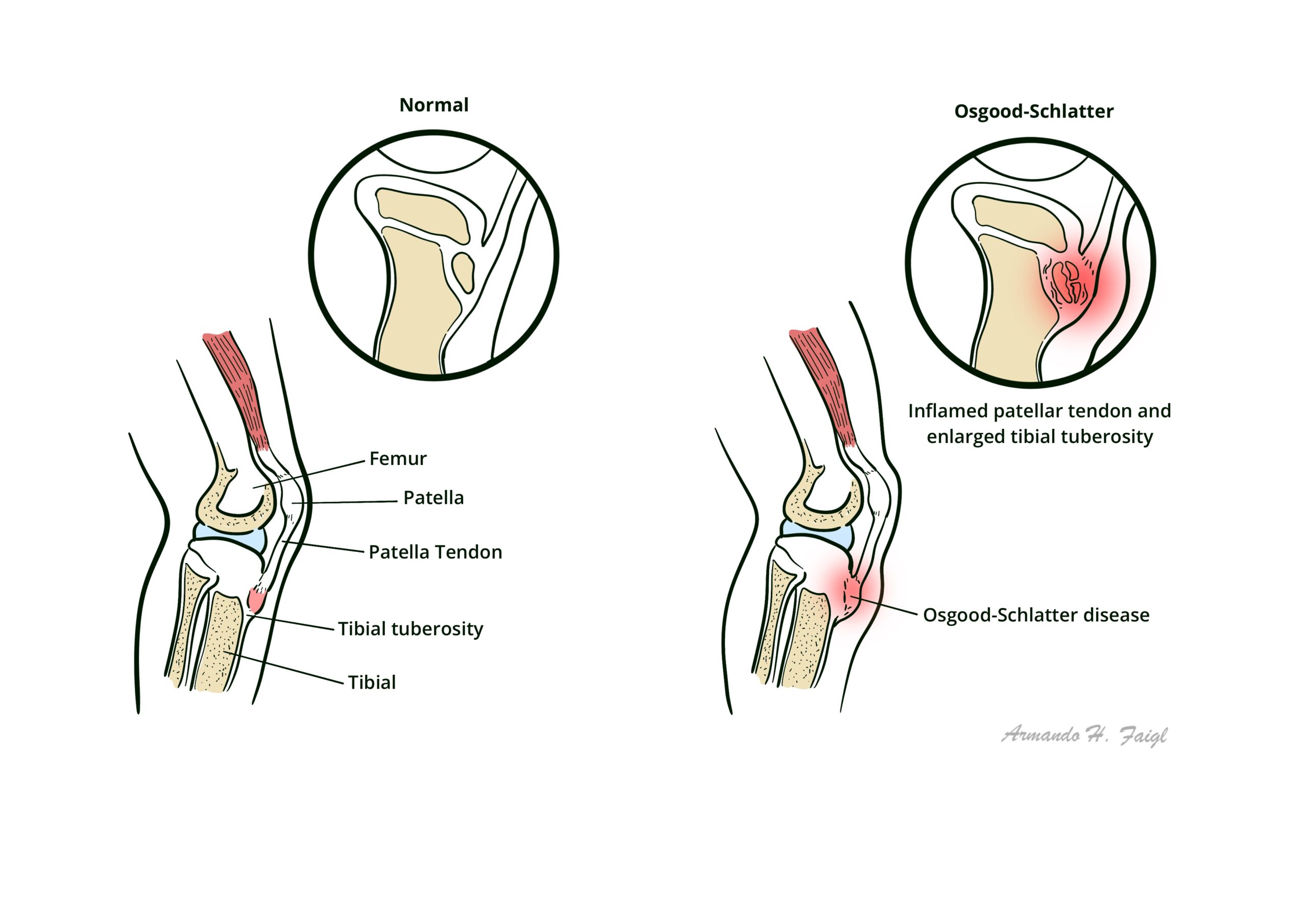 OSD occurs from repetitive quadriceps contraction such as jumping and running. Quadriceps contraction occurs through the patellar tendon at its insertion upon the skeletally immature tibial tubercle during its apophysis transformation and fusion between 11-18 years of age.