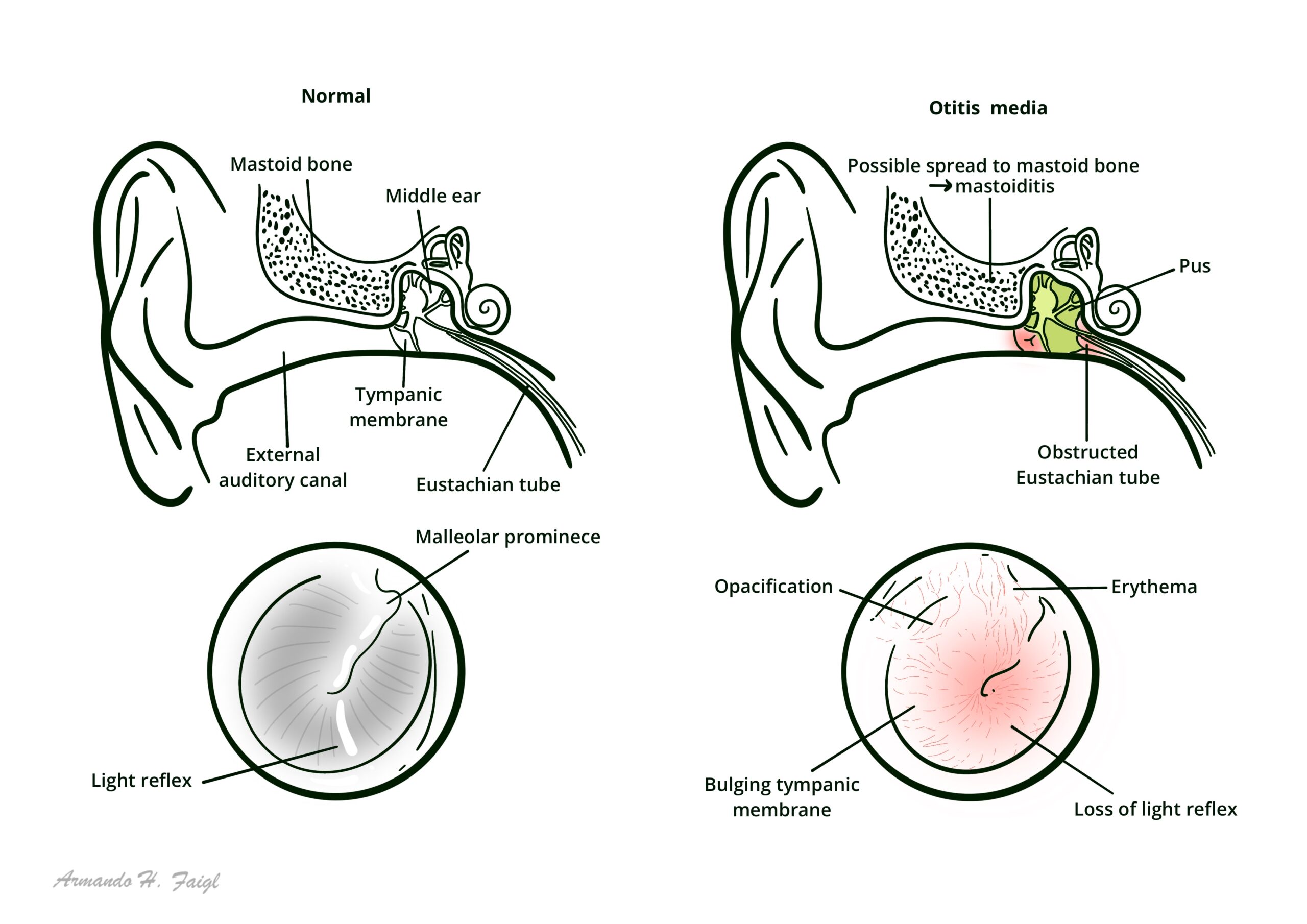 Otitis media (OM) is one of the most common infections in children. OM is inflammation of the middle ear and is usually secondary to bacterial and/or viral infection. It is a complication of eustachian tube dysfunction that occurred during an acute viral upper respiratory tract infection (URTI). The URTI causes effusion in the middle ear which can cause a secondary bacterial infection. The routine prescription of antibiotics in OM is NOT indicated. The overuse of antibiotics may contribute to increasing antimicrobial resistance. Rare complications of AOM include mastoiditis and facial nerve palsy.
