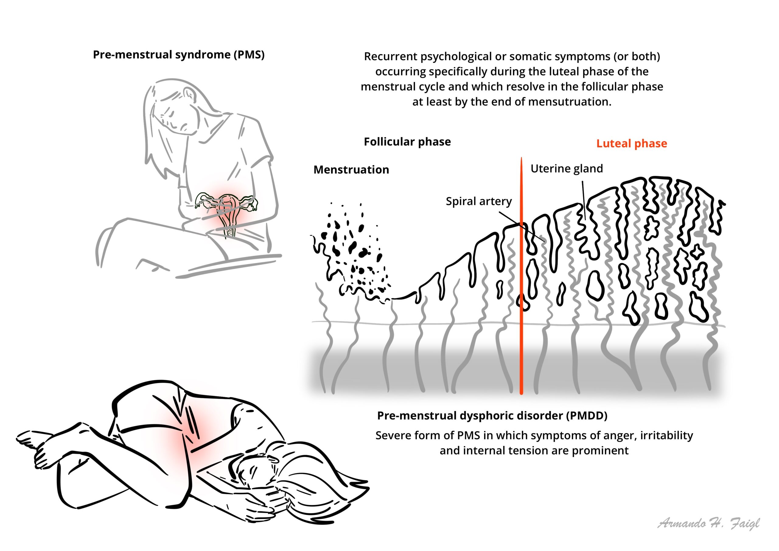 PMS: Recurrent psychological or somatic symptoms (or both) occurring specifically during the luteal phase of the menstrual cycle and which resolve in the follicular phase at least by the end of mensutruation