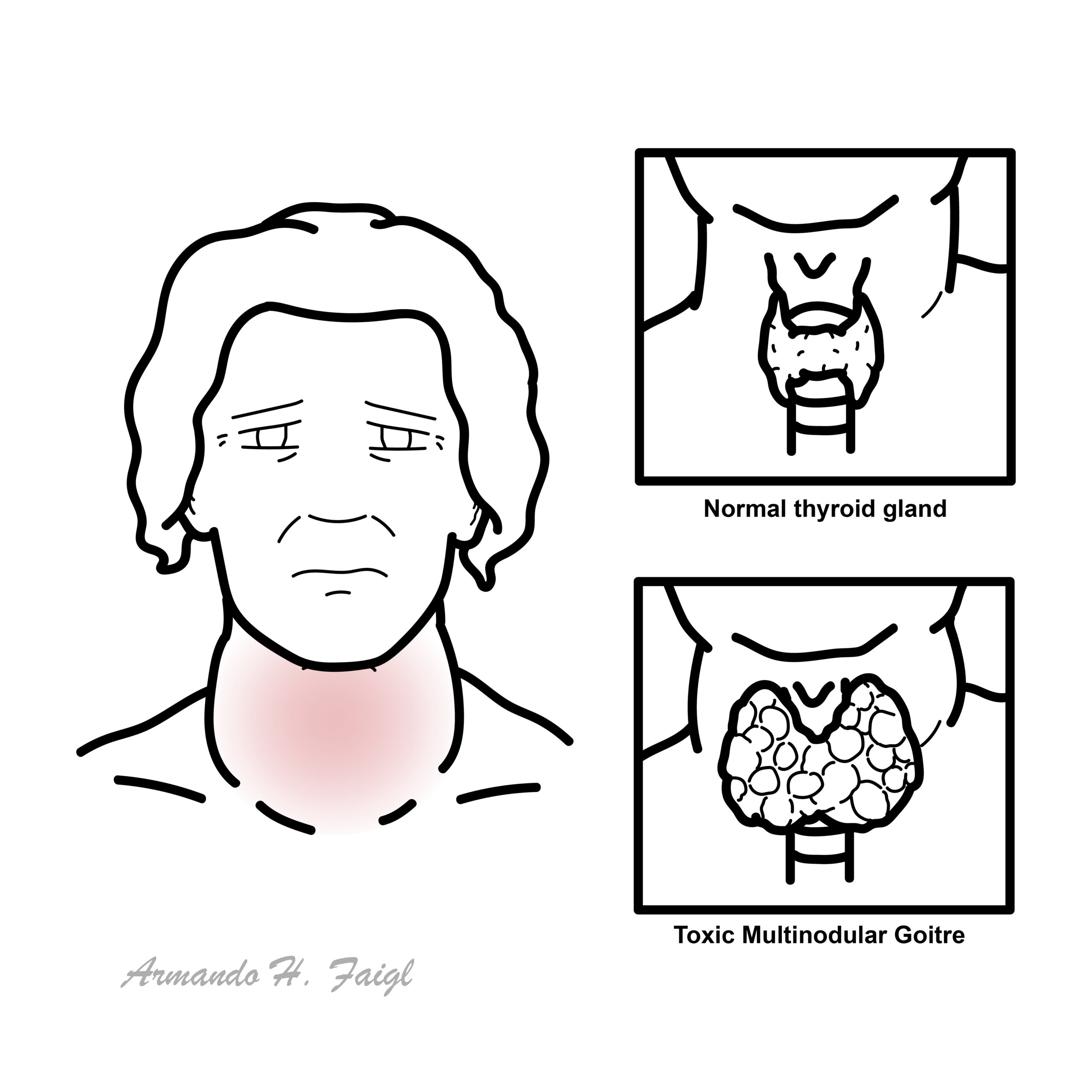 Toxic Multinodular Goitre (TMNG) is the second most common cause of hyperthyroidism caused by a long-standing goitre and/or iodine deficiency which results in an increased risk of mutation and consequent TSH-independent autonomic function of thyroid nodules to produce excess thyroid hormones. Common clinical manifestations include hyperthyroidism and a painless thyroid goitre with palpable nodules. The disease can be addressed and treated early on, with a good prognosis and clinical outcomes.
