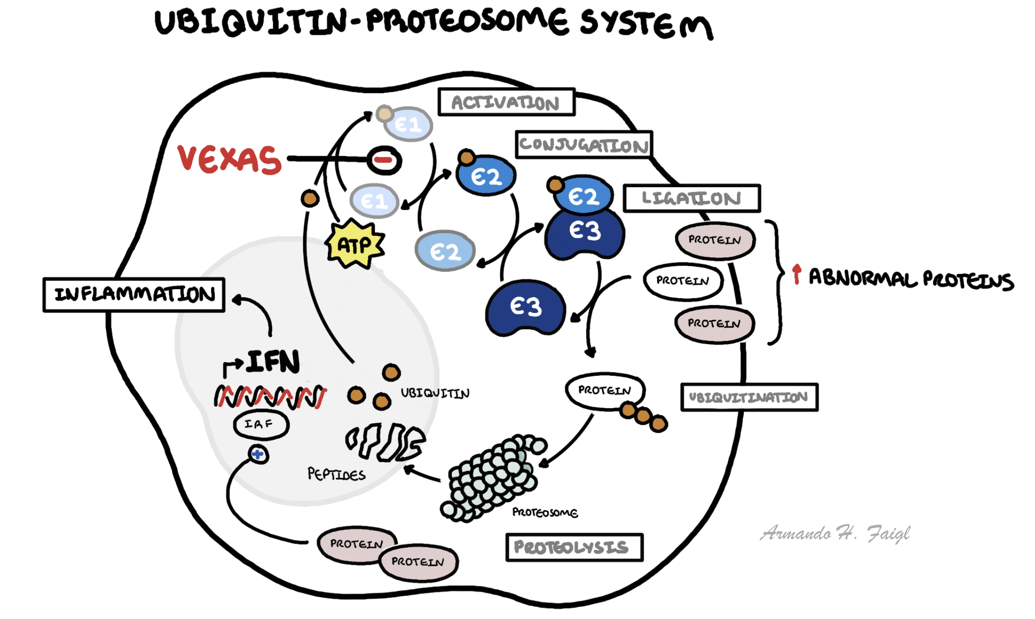 - Somatic UBA1 mutation → defective ubiquitin activation